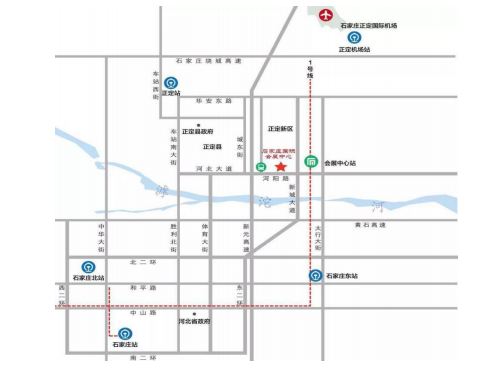 石家莊東站—石家莊國(guó)際會(huì)展中心 出租車:距離 14.5 公里,約 18 分鐘。地鐵:地鐵 1 號(hào)線→石家莊國(guó)際會(huì)展中心